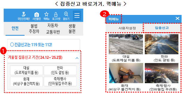 - 도로 파손, 불법 주정차, 시설물 붕괴 위험 등 신고 가능