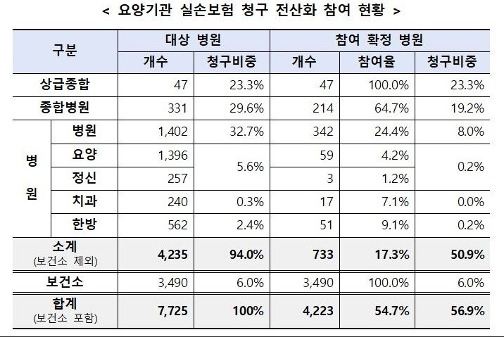 실손보험 청구 전산화가 첫발을 떼게 됐지만, 참여하는 의료기관이 전체의 55% 수준에 그친 점은 한계입니다.