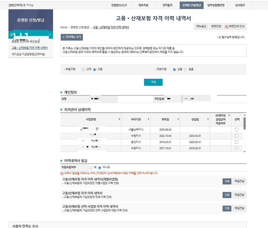 - 메인 화면에서 [개인서비스] → [고용·산재보험] → [이력조회/증명서] 메뉴로 이동
